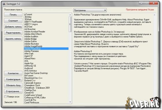 База данных с описаниями "пасхальных яиц" (скрытых возможностей в программах). Секреты таких известных продуктов, как Adobe illustrator, Acrobat reader, Acdsee, Corel Draw, Delphi, Dreamweaver, Fine reader, Firefox,Windows 7, Internet Explorer и многие другие