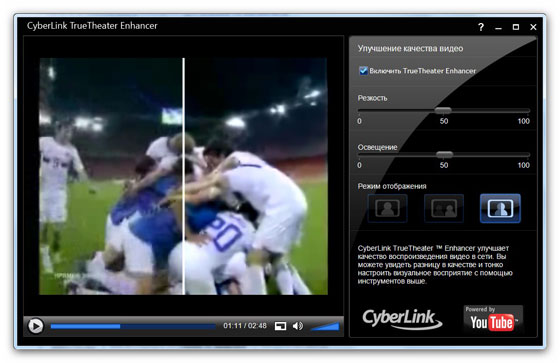 CyberLink TrueTheater Enhancer - это приложение позволяет заметно повысить качество воспроизведения видеороликов, включая контент, снабженный пометками «High Quality» и «HD». В основе продукта лежат те же самые технологии повышения качества цифрового изображения, которые использовались компанией CyberLink в ее флагманском продукте – популярном программном DVD-проигрывателе PowerDVD. Портал YouTube представляет собой крупнейшее онлайн-хранилище видеоматериалов, предоставленных любителями и профессионалами. Однако, большинство публикуемых на сайте роликов не обладают исключительным качеством. Приложение CyberLink TrueTheater Enhancer обеспечит повышенную четкость картинки, устранит наиболее заметные недочеты и позволит зрителям получить больше удовольствия от просмотра потокового видеоконтента.