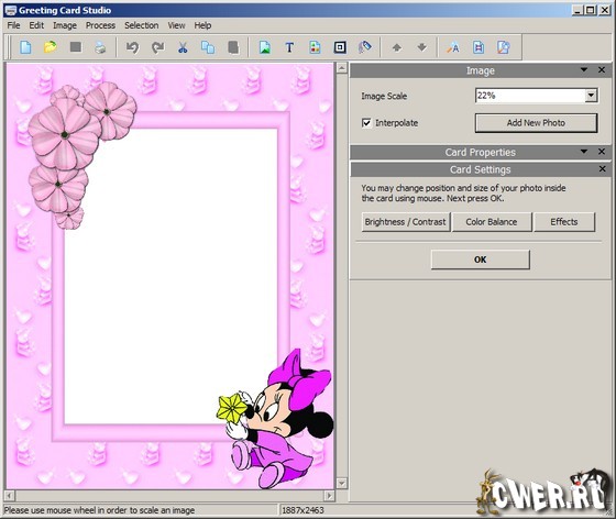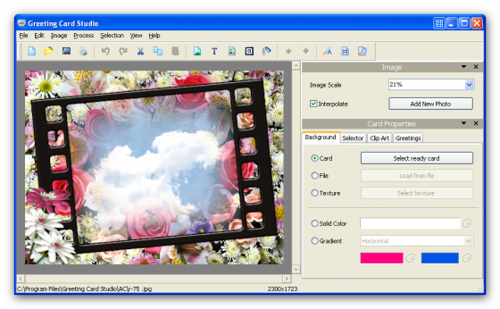 Greeting Card Studio - легкая в использовании программа для быстрого создания высококачественных поздравительных открыток. С помощью этой программы вы сможете создавать открытки, используя ваши собственные изображения, фон и текст. Программа содержит в себе готовые профессиональные шаблоны, предназначенные для быстрого создания открытки. Вам нужно всего-лишь выбрать бумагу, нужный дизайн, открыть понравившийся шаблон, отредактировать открытку и распечать ее на принтере. Также вы сможете создать собственный уникальный дизайн и наложить на картинки эффекты, рамки, границы, сделать фон и наложить различные изображения на вашу открытку. При этом, вам дается возможность масштабирования и переворачивания фотографий как вы пожелаете. Готовый результат вы сможете распечать на принтере или сохранить в один из графических форматов.