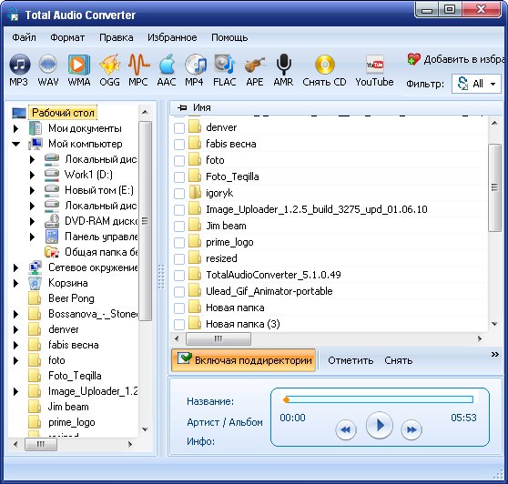 Audio Converter необходим для всех, кто хочет создавать собственные музыкальные коллекции. Теперь Вы сможете избавиться от лежащих повсюду аудио СD, конвертируя любой аудио файл в файл другого формата (WAV в MP3, или MP3 в OGG без создания промежуточного WAV файла), преобразовать канал (стерео в моно) или изменить поток и частоту. Даже если Вы просто хотите конвертировать MP3 в AAC, чтобы слушать музыку на мобильном телефоне, Total Audio Converter лучшее решение.