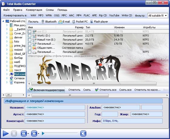 Total Audio Converter необходим для всех, кто хочет создавать собственные музыкальные коллекции. Теперь Вы сможете избавиться от лежащих повсюду аудио СD, конвертируя любой аудио файл в файл другого формата (WAV в MP3, или MP3 в OGG без создания промежуточного WAV файла), преобразовать канал (стерео в моно) или изменить поток и частоту. Даже если Вы просто хотите конвертировать MP3 в AAC, чтобы слушать музыку на мобильном телефоне, Total Audio Converter лучшее решение.