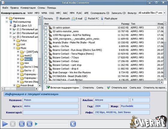 FairStars Audio Converter - является профессиональным инструментом для конвертации аудио файлов самых разнообразных форматов (WAV, APE, OGG, MP1, MP2, MP3, WMA, WMV, ASF в WMA, MP3, OGG, APE, WAV). Кроме конвертации утилита позволяет нормализовать композиции по звучанию, улучшить качество воспроизведения, имеет встроенный плеер и позволяет редактировать ID3 теги.