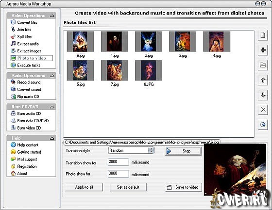 Aurora Media Workshop является программой, включающий в себя полный спектр средств для работы с видео и аудио файлами. Аудио и видеo конвертер, нарезка и соединение треков, граббер аудио CD, извлечение аудио из видео файлов, прожиг CD, создание видео CD из набора фотографий с множеством эффектов перехода, извлечение картинок (фреймов) из видео файлов, граббер DVD (VOB, DAT) в видео форматы, а аудио в MP3, WMA, WAV форматы, поддержка: AVI, MPEG1, MPEG2, ASF, WMV, VOB, DAT, DivX, XviD, MP3, WMA, WAV, OGG и других форматов.