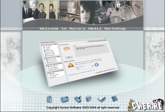 Aurora Media Workshop является программой, включающий в себя полный спектр средств для работы с видео и аудио файлами. Аудио и видеo конвертер, нарезка и соединение треков, граббер аудио CD, извлечение аудио из видео файлов, прожиг CD, создание видео CD из набора фотографий с множеством эффектов перехода, извлечение картинок (фреймов) из видео файлов, граббер DVD (VOB, DAT) в видео форматы, а аудио в MP3, WMA, WAV форматы, поддержка: AVI, MPEG1, MPEG2, ASF, WMV, VOB, DAT, DivX, XviD, MP3, WMA, WAV, OGG и других форматов