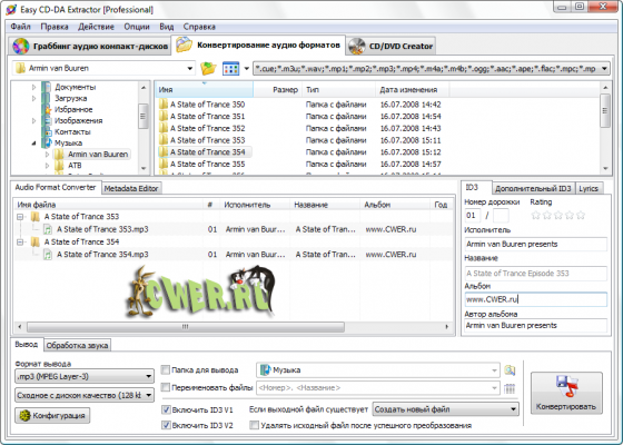 Easy CD-DA Extractor - программа для преобразования аудио-CD в качественные цифровые аудиофайлы, а также для записи MP3, WAV MP4, Windows Media Audio, FLAC, Ogg Vorbis, AAC и Monkey-s файлов на аудио-CD. Допускается преобразование аудиотреков непосредственно в MP3, WMA, VQF, OGG или WAV и конвертирование из одного аудиоформата в другой. Одна из основных характерных черт - возможность использования как стандартных Windows ACM-драйверов, так внешних или внутренних кодеков (Wave/PCM, Wave/ADPCM, LAME MP3 Encoder, TwinVQ VQF Encoder, Fraunhofer MP3 Encoder, Windows Media Audio Encoder и др.). Поддерживается загрузка данных о диске из CDDB, использование и редактирование CDPlauer.ini, ID3/ID3V2/ID3W-тегов, нормализация уровня громкости, удаление пауз. Работает практически со всеми IDE/SCSI/USB/FIREWIRE-драйвами. Многоязыковой интерфейс, русский присутствует.