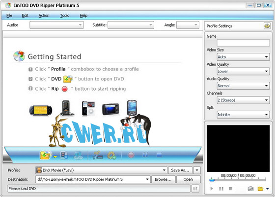 ImTOO DVD Ripper Platinum - это мощная утилита для копирования DVD, которая поможет Вам быстро преобразовать DVD в любой формат видео файлов. Программа совмещает функции DVD- риппера и DVD- аудиориппера, т.е. она сможет конвертировать DVD во все популярные форматы видео, такие как AVI, MPEG, WMV, DivX, RM, MOV, MP4, 3GP, 3G2, Xvid, ASF и т.п. и популярные аудио форматы - MP3, WAV, WMA, AAC, AC3, M4A, MP2, OGG. Поддерживает конвертацию для iPod, мобильных телефонов, PSP, DVD, MP3 и MP4 плееров.