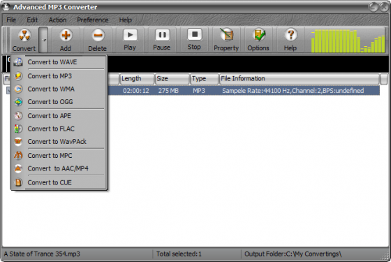 Advanced MP3 Converter позволяет позволяет быстро и качественно конвертировать аудио файлы из одного формата в другой.Конвертирование происходит напрямую без использования промежуточных файлов, в процессе конвертации музыкальные композиции автоматически нормализуются, присутствуют возможности по редактированию информации в MP3 id3 v1 , MP3 id3 v2, APE, MP4, WMA, а также предусмотрена возможность прожига CD дисков.