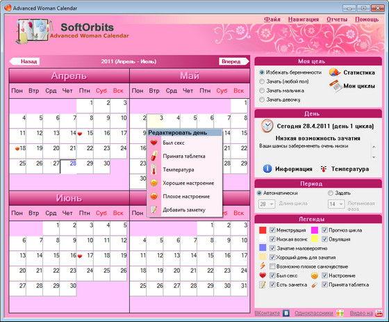 Advanced Woman Calendar - это надежный и простой в использовании женский календарь. Он вычисляет дни цикла с высокими и низкими шансами зачатия, помогая вам тем самым избежать нежелательной беременности, либо, напротив, зачать ребенка. Программа также поможет Вам повысить шансы зачатия мальчика либо девочки. Женский календарь поможет вам использовать метод натуральной контрацепции. Он показывает дни с повышенной вероятностью зачатия, дни овуляции и месячных в виде цветного календаря.