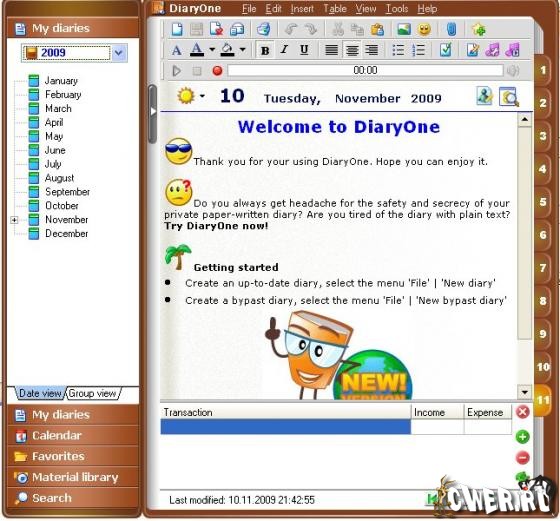 DiaryOne - персональный программный дневник с элегантным интерфейсом, который может с успехом заменить личный дневник, который многие привыкли вести в рукописном виде. Наделен широкими возможностями, такими как: форматирование текста, включение в запись изображений и мультимедиа, а также опцией шифрования данных. Кроме этого, возможно создание голосовых заметок. Работает через веб-службу MSN Spaces. В программу включены наборы подложек для создания страниц и графические смайлики. Дополнительные опции включают в себя: включают систему поиска по дневнику, закладки "любимые" записи, встроенный календарь, создание резервной копии, спел-чекер (проверка английской орфографии), поддержку скинов (которые множество можно скачать с домашнего сайта), экспорт в CHM и PDF, запись на CD/DVD (c помощью плагинов), автоматическое обновление программы через Интернет и многое другое.