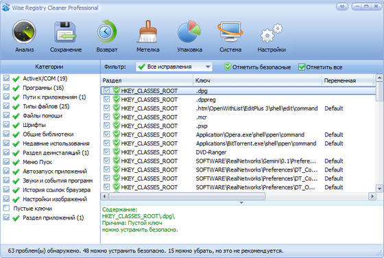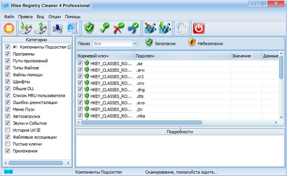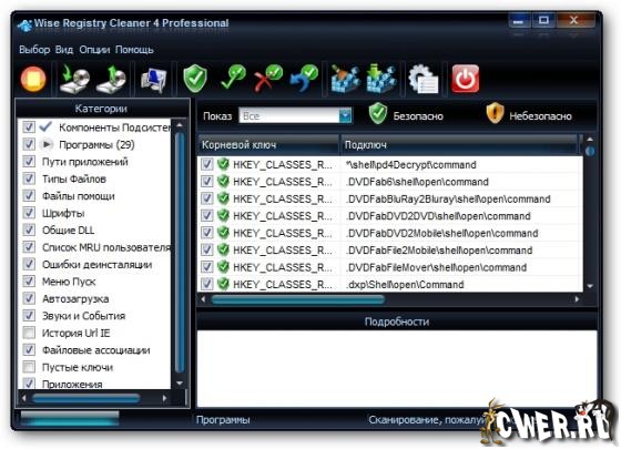 Wise Registry Cleaner - бесплатная версия безопасной утилиты для чистки реестра Windows. Программа сканирует реестр и ищет в нем некорректную и устаревшую информацию, после удаления которой операционная система работает более быстро. После того, как программа проанализирует проблемы вашей системы, вы можете сами просмотреть каждую найденную неполадку и посмотреть ее детальное описание. Все изменения, внесенные программой в реестр, могут быть отменены за два клика мышью. Также стоит отметить, что интерфейс программы переведен на множество языков, включая русский язык.