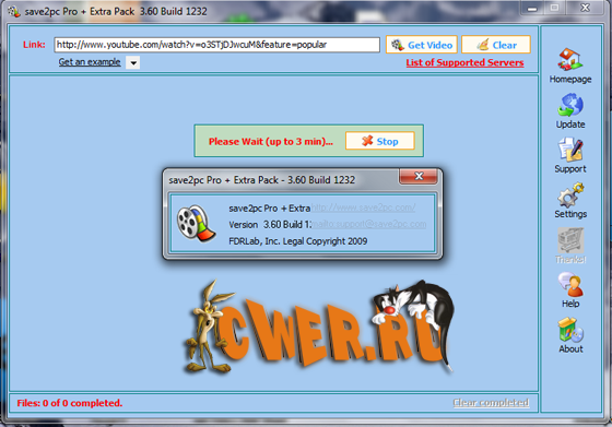 Обновилась программа Save2pc. Это крайне простая в использовании утилита, которая позволяет сохранять видео с известного файлового хранилища YouTube и Google Video. Просто вставьте ссылку на нужный файл в окошке программы, укажите папку для сохранения видео, а все остальное save2pc сделает сама, вы же в результате получите интересующий вас .avi, .mpeg, .flvG файл или файл в мобильном формате mov, mp4, 3gp, mp3, wav.