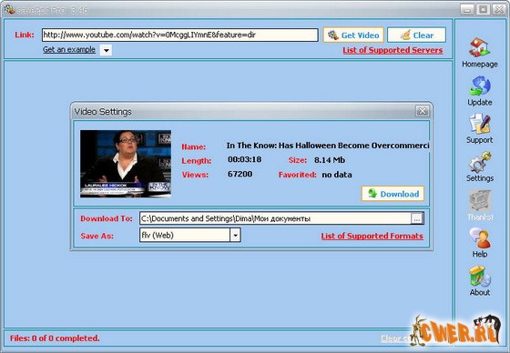 Обновилась программа Save2pc (ранее - YouTube Downloader). Это крайне простая в использовании утилита, которая позволяет сохранять видео с известного файлового хранилища YouTube и Google Video. Просто вставьте ссылку на нужный файл в окошке программы, укажите папку для сохранения видео, а все остальное save2pc сделает сама, вы же в результате получите интересующий вас .avi, .mpeg, .flvG файл или файл в мобильном формате mov, mp4, 3gp, mp3, wav.