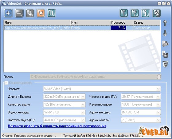 Многие из этих веб-сайтов держат видео в FLV формате, и большинство людей не знает как проигрывать эти файлы VideoGet также позволит вам конвертировать все видео в множество популярных форматов для более комфортного проигрывания VideoGet поддерживает AVI, MPEG1, MPEG2, WMV, FLV, MP4, 3GP, MP3 форматы, так что вы имеете возможность не только посмотреть видео на своем компьютере, но и переписать его на свой iPod, мобильный телефон или любой другой портативный прибор. Кроме того вы самостоятельно можете задавать настройки конвертации.