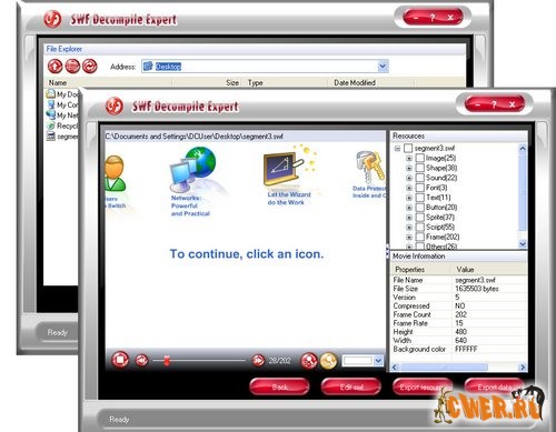Данная программа позволяет экспортировать Fla-данные, которые можно легко редактировать в родной среде Flash и конвертировать между .swf и .exe форматами. Все компоненты - изображения, звуки, скрипты, тексты, формы, фреймы, шрифты, кнопки и спрайты будут полностью экспортированы. Программа поделена на две части - в первой части Вы выполняете все операции с файлами (открытие, редактирование и многое другое), во второй половине проигрыватель, с помощью которого Вы сможете просмотреть не только flash-ролик, но и другие компоненты flash (картинки, звуки, шрифты, формы и т.д.), что довольно удобно при работе.