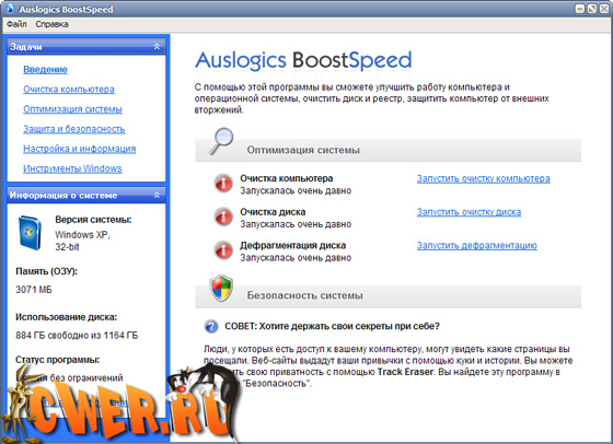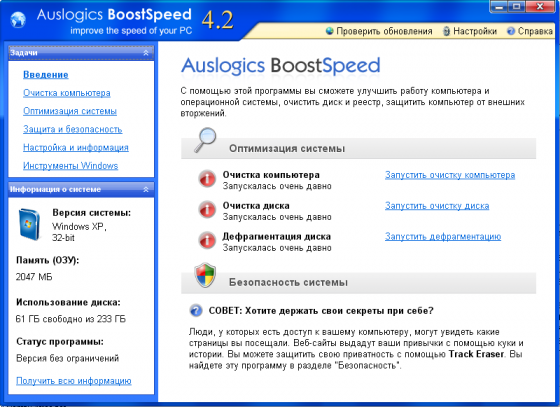 Обновилась популярная утилита для ускорения работы системы, программ и Интернет-соединения - BoostSpeed от компании AusLogics. Программа оптимизирует компьютерную память, ускоряет загрузку Windows, повышает быстродействие Microsoft Office, The Bat, FireFox, Opera, чистит реестр и диск компьютера. После дефрагментации реестра BoostSpeed, скорость компьютера возрастет за счет уменьшения фрагментации файлов реестра, уменьшения их размера, а также благодаря устранению ошибок в реестре.