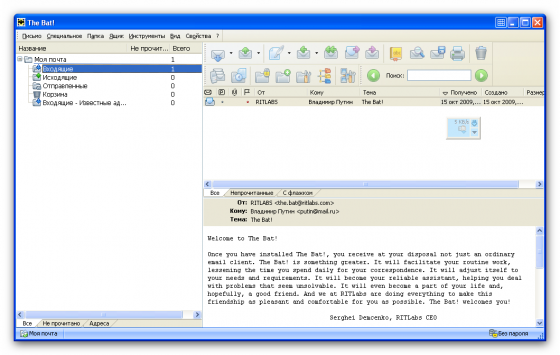 The Bat! - самый мощный и популярный почтовый клиент. Поддерживаеся любое число почтовых ящиков POP и IMAP, шифрование переписки с помощью PGP , имеется мощная система сортировки почты, диспетчер писем для оповещении о приходе почты на сервер и управления входящей почтой прямо на сервере и множество других, не менее полезных возможностей. Что любопытно, довольно трудно вкратце обьяснить, чем же мышь лучше других почтовых программ (того же Outlook Express), но поверьте на слово, а лучше - убедитесь сами, что на сегодняшний день The Bat! является одной из наиболее подходящих почтовых программ для переписки на русском языке.