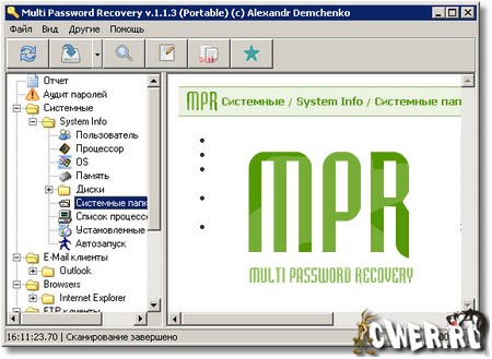 Multi Password Recovery - многофункциональное решение для Windows по расшифровке и тестировании паролей на стойкость. MPR автоматически находит и мгновенно расшифровывает пароли из более чем 90 популярных программ (FTP, E-mail клиенты, Интернет пейджеры, Браузеры и пр.), при этом, не требуя вмешательства пользователя. Кроме расшифровки, показывает пароли под здездочками, позволяет скопировать SAM файл, удалить сохраненные пароли, сгенерировать новый пароль, сохранить отчеты на жесткий диск.