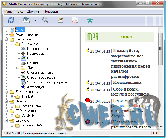 Multi Password Recovery - многофункциональное решение для Windows по расшифровке и тестировании паролей на стойкость. MPR автоматически находит и мгновенно расшифровывает пароли из более чем 90 популярных программ , при этом, не требуя вмешательства пользователя. Кроме расшифровки, показывает пароли под здездочками, позволяет скопировать SAM файл, удалить сохраненные пароли, сгенерировать новый пароль, сохранить отчеты на жесткий диск.