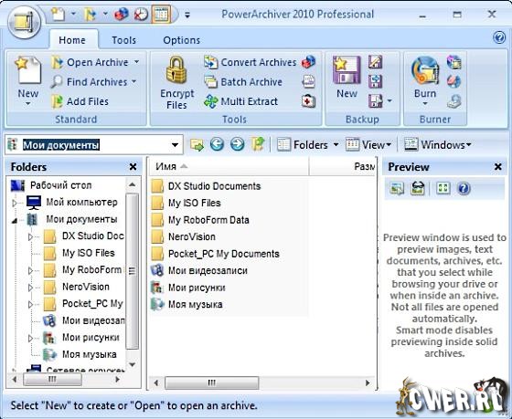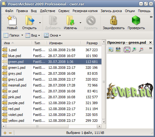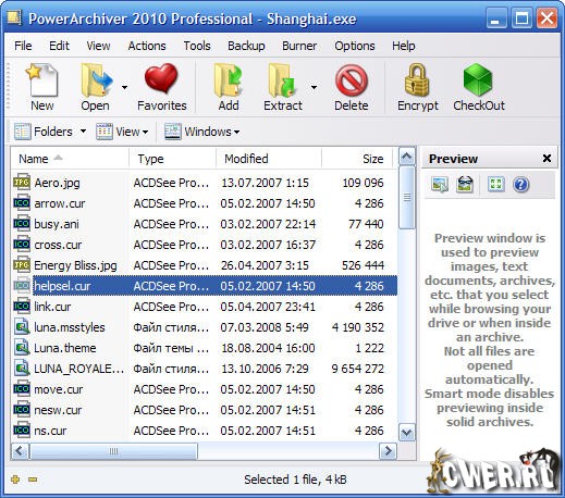 PowerArchiver 2009 - многофункциональный архиватор. Программа может выполнять практически все операции, необходимые при работе с архивами (создание, просмотр, извлечение файлов; добавление файлов; создание самораспаковывающихся и многотомных архивов; шифрование методами Blowfish 128-bit, DES 64-bit, Triple DES 128-bit и AES 128-bit; восстановление повреждённых зип-архивов и т.д.).