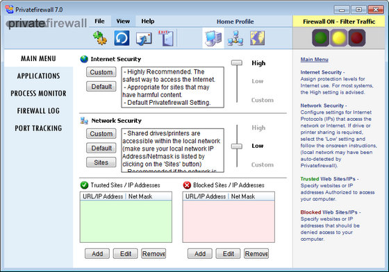 Privatefirewall - это персональный брендмауэр, который предназначен для защиты как офисных, так и домашних ПК от различных сетевых угроз и опасных приложений. Программа не требует особых знаний в настройке, способна эффективно выполнять свои функции сразу после установки, но для продвинутых пользователей имеется большое количество настроек и параметров конфигурации. В Privatefirewall встроен сам брендмауэр, фильтр URL, модуль мониторинга запущенных процессов, а также модуль работы с приложениями. Также программа осуществляет сканирование портов, отслеживание IP-пакетов и другие полезные