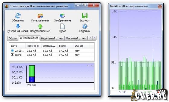 NetWorx - бесплатная утилита для учета интернет-трафика и мониторинга скорости Интернета на вашем компьютере. Программа работает с любым кабельным или беспроводным подключением, а также модемом, предоставляя удобную статистику, отчеты и графики. Вы сможете измерить реальную скорость и загрузку вашего интернет-подключения, просматривать ежедневные, недельные и месячные отчеты и получать уведомления о перерасходе трафика. Интересным применением NetWorx можно назвать и контроль за сетевой активностью ПК. Если объём трафика вдруг возрос - скорее всего, в системе поселился вирус или троян.