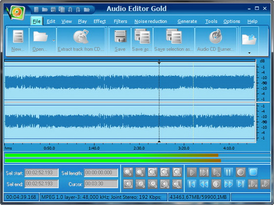 Audio Editor Gold - является передовым и мощным, полнофункциональным программным обеспечением для редактирования аудио файлов. Вы можете использовать Audio Editor Gold для записи собственной музыки, голоса или другого звука, редактировать ее, смешать его с другими аудио или музыкальными частями, добавлять эффекты, такие как эхо, хорус и реверберации, отредактированные файлы вы можете записать на компакт-диски , загружать в интернет, или отправлять по электронной почте. Интуитивный, простой в использовании интерфейс позволяет выполнять множество операций без каких-либо трудностей! Audio Editor Gold поддерживает все основные форматы аудио-файлов.