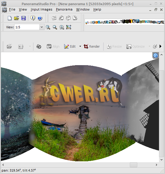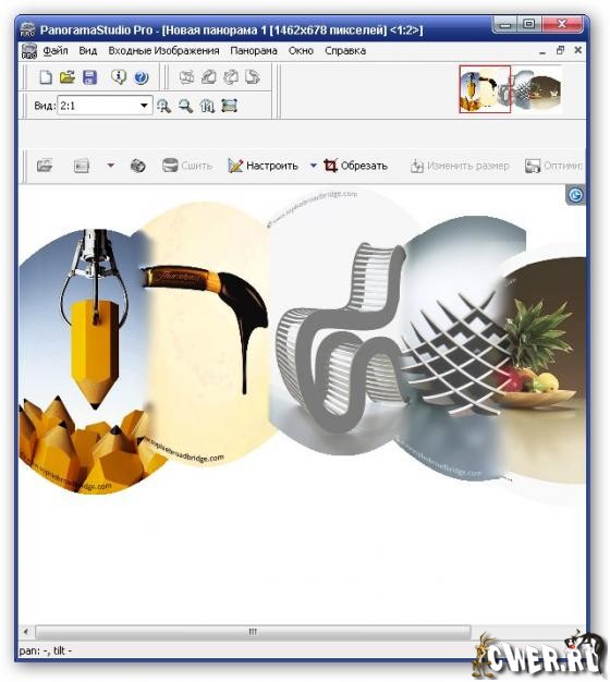 PanoramaStudio - программа, которая автоматически "сшивает" картинки между собой, обеспечивая при этом плавный и незаметный переход от одной к другой. Перед выполнением операции исходные картинки можно обрезать, отмасштабировать и повернуть. PanoramaStudio поддерживает такие форматы как JPG, TIFF, PSD, BMP, PNG, PCX, RAS, IFF, TGA, а также многие файлы RAW. Программа автоматически определяет фокусное расстояние, может автоматически исправлять дисторсии объектива, а также улучшать перспективу.