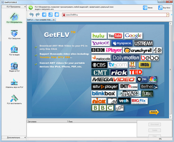 GetFLV Pro - это сборник из 7 модулей, который позволяет производить весь спектр операций с .flv файлами. GetFLV Pro позволяет скачивать, управлять, конвертировать в различные форматы и из различных форматов, извлекать звук, восстанавливать и воспроизводить FLV видео.