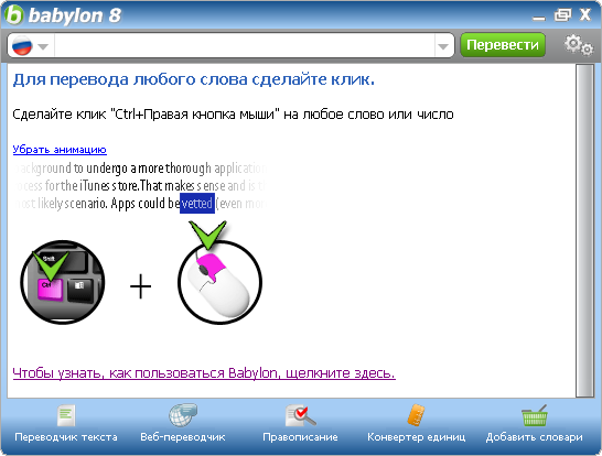 Babylon 8 - словарь, позволяющий переводить слова с одного языка на другой. Работать со словарем очень просто - после нажатия кнопкой мыши на интересующее слово появляется окно с его переводом. Кроме перевода слов, программа включает в себя английские тематические и толковые словари, а также имеет функции конвертации валют на текущую дату и перевода мер из одной системы в другую. Кроме словаря, который можно использовать в любое время, при онлайн-работе, Babylon позволяет воспользоваться огромными базами данных, сосредоточенными в таких глоссариях, как Britannica, Amazon, Accuweather и другие. Теперь вам не потребуется много времени на исправление орфографических ошибок и на поиск правильного слова или перевода. С данной программой читать и писать на всех языках гораздо проще, быстрее и эффективнее. Программа делает всю работу за вас, при помощи проверки орфографических ошибок в реальном времени, умного переводчика на любой язык и с любого языка, а также автоматического подбора выражений.