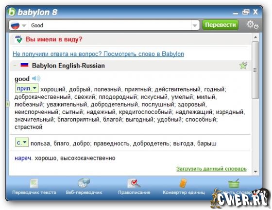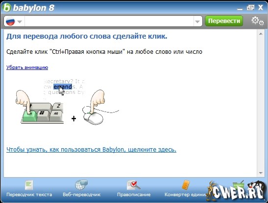 Babylon 8 - словарь, позволяющий переводить слова с одного языка на другой. Работать со словарем очень просто: после нажатия кнопкой мыши на интересующее слово появляется окно с его переводом. Кроме перевода слов, программа включает в себя английские тематические и толковые словари, а также имеет функции конвертации валют на текущую дату и перевода мер из одной системы в другую. Англо-русско-английский и другие словари можно закачать дополнительно с сайта разработчика.
