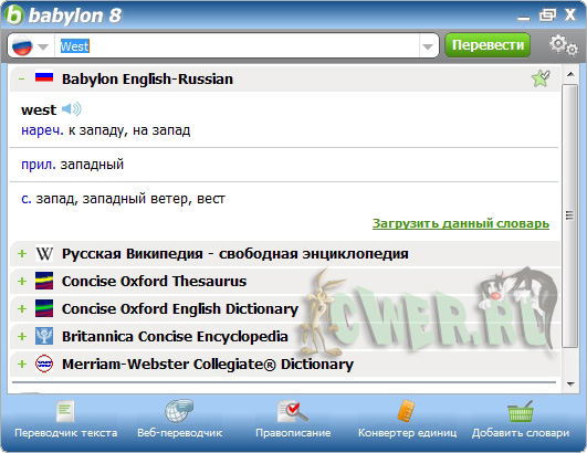 Babylon 8 - словарь, позволяющий переводить слова с одного языка на другой. Работать со словарем очень просто - после нажатия кнопкой мыши на интересующее слово появляется окно с его переводом. Кроме перевода слов, программа включает в себя английские тематические и толковые словари, а также имеет функции конвертации валют на текущую дату и перевода мер из одной системы в другую. Англо-русский, русско-английский и другие словари можно закачать дополнительно с сайта разработчика. Кроме словаря, который можно использовать в любое время, при онлайн-работе, программа позволяет воспользоваться огромными базами данных, сосредоточенными в таких глоссариях, как Britannica, Amazon, Accuweather и другие.