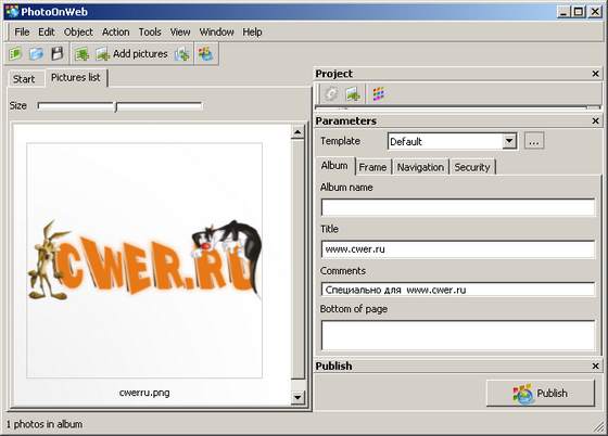 Вам достаточно выбрать фотографии, стиль и щелкнуть клавишу «Publish». Вы можете разместить фото на вашем сайте переслав их по FTP. Готовый альбом выглядит вполне профессионально, отображается в любом браузере и обладает простой и понятной системой навигации.