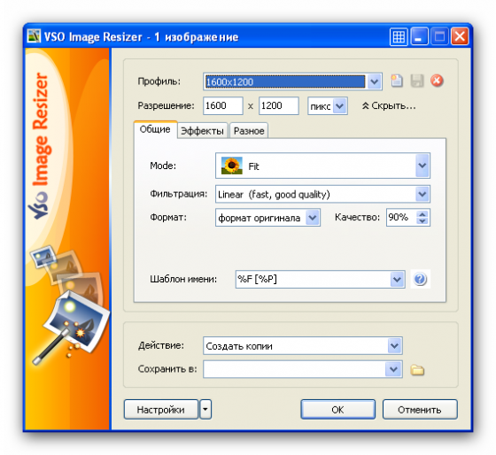VSO Image Resizer - программа для изменения размеров цифровых картинок и изображений в различных графических форматах (на данный момент поддерживается работа с файлами JPEG, GIF, BMP, TIFF, CR2, NEF и т.д.). Также в утилите имеются возможности для компрессии файлов, конвертирования из одного формата в другой, экспорта, наложения прозрачных прозрачных и управления картинками. VSO Image Resizer интегрируется в оболочку Windows, может работать в пакетном режиме, обладает расширенными опциями настройки для продвинутых пользователей.