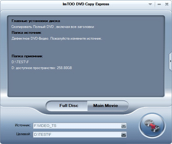 ImTOO DVD Copy Express - простая в использовании и быстрая утилита для копирования видео с дисков DVD. Предоставляет пользователю наилучший способ для быстрого копирования DVD-фильмов с высоким качеством. Программа может скопировать диск один к одному или с легкостью сжать DVD-9 (двухслойный диск) до размера DVD-5. Возможности программы также включают в себя удаление меню диска, выбор субтитров, аудиодорожек, копирование отдельно основного фильма для создания собственного DVD.