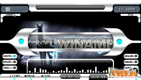 Знаменитый проигрыватель Winamp теперь и на PSP. У этой программы привлекательный эквалайзер. Она поддерживает многие форматы музыки. Winamp русифицированн и довольно прост в управлени. Так же в программе вы можете увидеть время и уровень заряда вашей батареии.