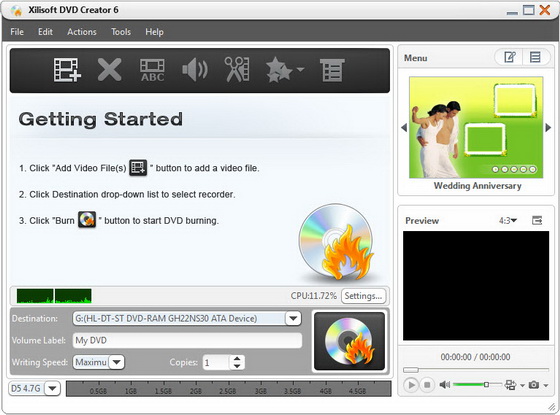 Xilisoft DVD Creator - программа для создания и записи (прожига) DVD с простым и удобным интерфейсом. Основные возможности: создание DVD с полноценными меню и субтитрами из AVI, MPEG, WMV, DV, DivX, Xvid, VOB, 3GP, 3G2, MP4 и других видеофайлов; выбор из имеющихся преднастроек или собственная настройка параметров видео - битрейда, фреймрейда, качества и других параметров DVD, поддержка NTSC и PAL, поддержка соотношений картинки 4:3 и 16:9, предварительный просмотр результата, наконец, прожиг созданного проекта на DVD. Возможно создание и запись на DVD ISО-образа. Поддерживаются DVD-R, DVD+R, DVD-RW, DVD+RW.
