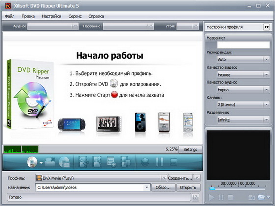 Xilisoft DVD Ripper Ultimate - программа для создания резервных копий DVD-дисков. Поддерживает риппинг во все самые популярные форматы, среди которых AVI, MPEG, WMV, DivX, 3GP, MOV, MP4, MP3, WAV, AAC, M4A. Программа позволяет выбрать язык субтитров, разбить файл на куски указанного размера, задействовать звук Dolby Surround, выбрать битрейт аудио. Кроме этого, программа анализирует тип процессора и в зависимости от этого выбирает наилучшую скорость риппинга. Также программа полностью задействует возможности последних процессоров и позволяет выполнять пакетное преобразование файлов.