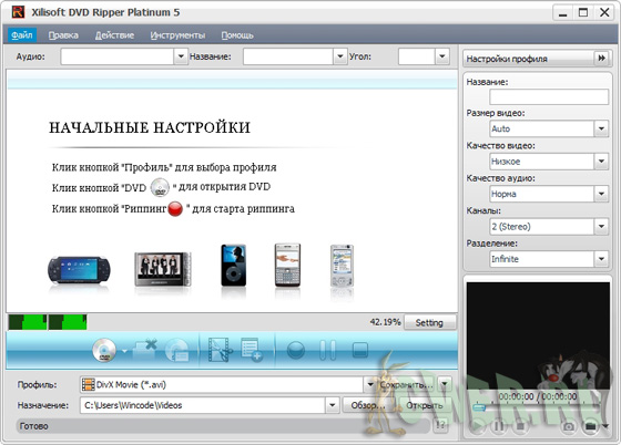 Xilisoft DVD Ripper Platinum - программа для создания резервных копий DVD-дисков. Xilisoft DVD Ripper Platinum поддерживает риппинг во все самые популярные форматы, среди которых VI, MPEG, WMV, DivX, 3GP, MOV, MP4, MP3, WAV, AAC, M4A. Программа позволяет выбрать язык субтитров, разбить файл на куски указанного размера, задействовать звук Dolby Surround, выбрать битрейт аудио. Кроме этого, программа анализирует тип процессора и в зависимости от этого выбирает наилучшую скорость риппинга. Xilisoft DVD Ripper Platinum полностью задействует возможности последних процессоров и позволяет выполнять пакетное преобразование файлов.