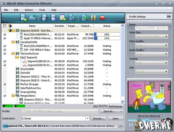 Xilisoft DVD Ripper Ultimate - мощная и удобная в использовании программа для копирования DVD-дисков с возможность конвертирования содержимого в соответствующие аудио и видео файлы типа AVI, MPEG, WMV, DivX, MP4, H.264, RM, MOV, M4V, XviD, 3GP, MP3, WMA, WAV, RA, M4A, AAC, AC3, OGG и т.д. Утилита способна создавать файлы, совместимые с iPod, iPhone, PSP, Apple TV и прочими портативными устройствами. Имеются опции конвертирования сегментов клипа, изменения размеров, наложения эффектов, добавления логотипов, предпросмотра результатов. Присутствует пакетная обработка файлов, получение информации из Интернет-баз и многие другие возможности.