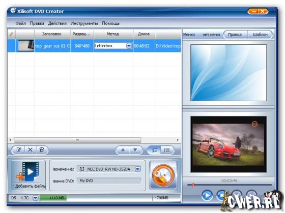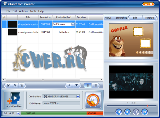 Xilisoft DVD Creator - программа для создания и записи (прожига) DVD с простым и удобным интерфейсом. Основные возможности: создание DVD с полноценными меню и субтитрами из AVI, MPEG, WMV, DV, DivX, Xvid, VOB, 3GP, 3G2, MP4 и других видеофайлов; выбор из имеющихся преднастроек или собственная настройка параметров видео - битрейда, фреймрейда, качества и других параметров DVD, поддержка NTSC и PAL, поддержка соотношений картинки 4:3 и 16:9, предварительный просмотр результата, наконец, прожиг созданного проекта на DVD. Возможно создание и запись на DVD ISО-образа. Поддерживаются DVD-R, DVD+R, DVD-RW, DVD+RW.