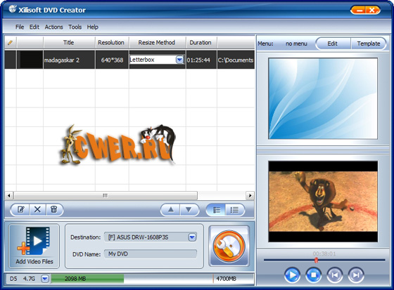 Xilisoft DVD Creator - программа для создания и записи (прожига) DVD с простым и удобным русским интерфейсом. Основные возможности, это - создание DVD с полноценными меню и субтитрами из AVI, MPEG, WMV, DV, DivX, Xvid, VOB, 3GP, 3G2, MP4 и других видеофайлов; выбор из имеющихся преднастроек или собственная настройка параметров видео - битрейда, фреймрейда, качества и других параметров DVD, поддержка NTSC и PAL, поддержка соотношений картинки 4:3 и 16:9, предварительный просмотр результата, наконец, прожиг созданного проекта на DVD. Возможно создание и запись на DVD ISО-образа. Поддерживаются DVD-R, DVD+R, DVD-RW, DVD+RW.