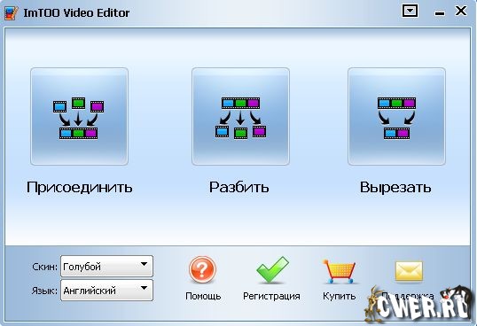 ImTOO Video Editor соединяет, обрезает и разделяет различные типы видеофайлов. Программа поддерживает 3GPP и 3GPP2, AVI, файлы Macromedia Flash, QuickTime, MPEG4, RAW h264, файлы Windows Media и MPEG. Утилиту просто установить и использовать. При запуске открывается окно приложения с тремя кнопками. В зависимости от выполняемой задачи необходимо нажать на одну из них: Соединить, Разбить, Обрезать.