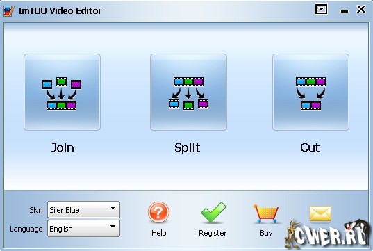 ImTOO Video Editor - соединяет, обрезает и разделяет различные типы видеофайлов. Программа поддерживает 3GPP и 3GPP2, AVI, файлы Macromedia Flash, QuickTime, MPEG4, RAW h264, файлы Windows Media и MPEG. Утилиту просто установить и использовать. При запуске открывается окно приложения с тремя кнопками. В зависимости от выполняемой задачи необходимо нажать на одну из них: Join (Соединить), Split (Разбить), Cut (Обрезать).