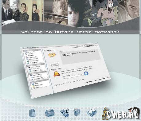 Aurora Media Workshop - является программой, включающий в себя полный спектр средств для работы с видео и аудио файлами. Аудио и видео конвертер, нарезка и соединение треков, граббер аудио CD, извлечение аудио из видео файлов, прожиг CD, создание видео CD из набора фотографий с множеством эффектов перехода, извлечение картинок (фреймов) из видео файлов, граббер DVD (VOB, DAT) в видео форматы, а аудио в MP3, WMA, WAV форматы, поддержка: AVI, MPEG1, MPEG2, ASF, WMV, VOB, DAT, DivX, XviD, MP3, WMA, WAV, OGG и других форматов.