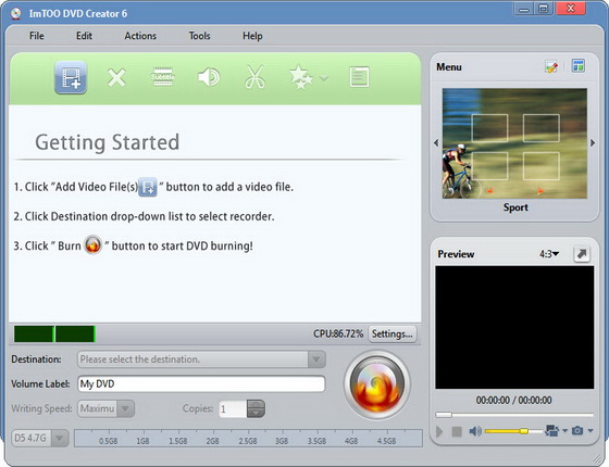 ImTOO DVD Creator - быстрый и легкий для использования конвертер DVD. Он поддерживает и конвертирует почти все популярные видео-форматы в DVD, и записывает на DVD, поэтому вы сможете посмотреть их на домашнем проигрывателе DVD. Обеспечивает много красивых меню для вашего DVD, поддерживает DVD-R, DVD+R, DVD-RW и DVD+RW. Легок в использовании, для того чтобы сделать свой DVD достаточно несколько нажатий на клавиши! Поддерживает множество видео-форматов, включая AVI, mpeg, WMV, DivX, Xvid, VOB, 3GP, MP4, и так далее. Позволяет вам переключатся между NTSC или PAL, записывать диски DVD, сохранять в ISO.