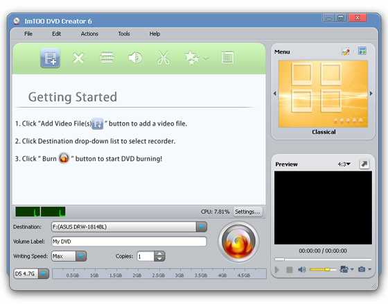 Профессиональная программа для создания и записи DVD из видео файлов форматов AVI, MPEG, DAT, MPG, WMV, ASF, MP4, 3GP, VOB с возможностью редактирования и создания меню. Позволяет определить NTSC или PAL, настроить соотношение видео 4:3 или 16:9, записывать ISO файлы и папки DVD с фильмом. Поддерживает множество форматов DVD, включая DVD-R, DVD+R, DVD-RW, DVD+RW, DVD-5, и DVD-9. Имеет простой и удобный интерфейс.