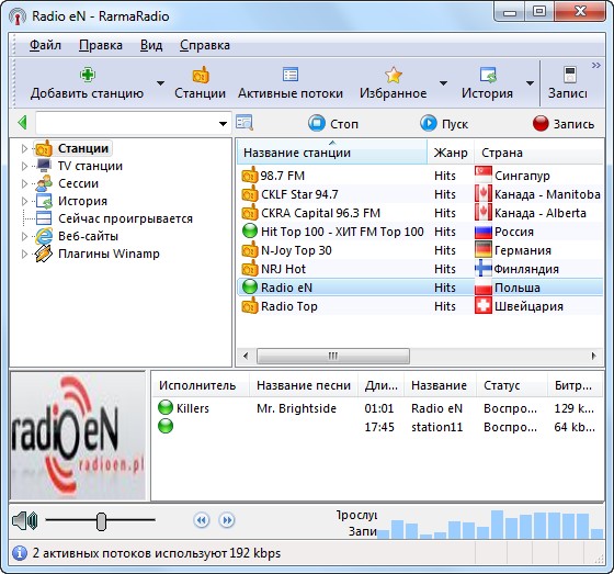 RarmaRadio - программа для прослушивания и записи интернет-радиостанций. Обладает большим набором возможностей, обеспечивая комфортное прослушивание радиостанций и удобную запись транслируемых данных. Программа содержит множество станций рассортированных на группы в зависимости от жанра музыки, битрейта, сети и региона, имеет функцию поиска станций, автоматически скачивает из Интернета информацию о проигрываемых песнях, включая альбомную графику, и поддерживает подключение плагинов медиаплеера Winamp. С помощью RarmaRadio можно слушая одну станцию, одновременно записывать несколько других интернет-радиостанций, осуществлять запись интернет-вещания по расписанию, а также автоматически начинать запись, в случае если заиграла определенная композиция. При сохранении полученных аудио файлов RarmaRadio добавляет в них теги.
