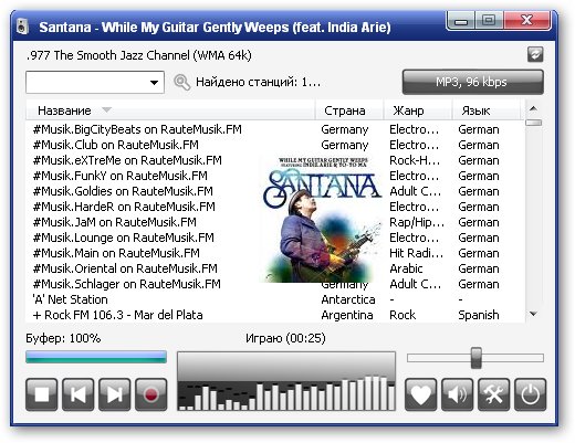 RarmaRadio - программа для прослушивания и записи интернет-радиостанций. Обладает большим набором возможностей, обеспечивая комфортное прослушивание радиостанций и удобную запись транслируемых данных. Программа содержит множество станций рассортированных на группы в зависимости от жанра музыки, битрейта, сети и региона, имеет функцию поиска станций, автоматически скачивает из Интернета информацию о проигрываемых песнях, включая альбомную графику, и поддерживает подключение плагинов медиаплеера Winamp. С помощью RarmaRadio можно слушая одну станцию, одновременно записывать несколько других интернет-радиостанций, осуществлять запись интернет-вещания по расписанию, а также автоматически начинать запись, в случае если заиграла определенная композиция. При сохранении полученных аудио файлов RarmaRadio добавляет в них теги.