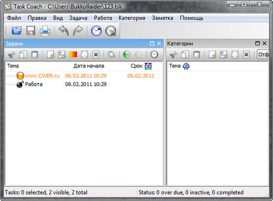 Task Coach - это программа-органайзер для записи текущих дел на самые разнообразные темы. Возможно построение древовидной структуры дел, отображение списком и многое другое. Очень проста в использовании, имеет русский интерфейс. Программа появилась в результате неудовлетворенности доступными ныне менеджерами задач, например Outlook или Lotus Notes, которые не обладают инструментами для создания сложных задач. Часто задачи или важные дела состоят из нескольких действий. Task Coach способен составлять сложные задачи.