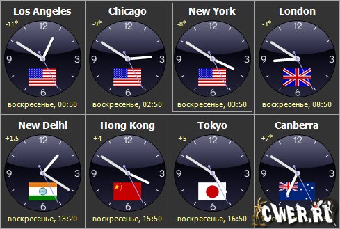 Sharp World Clock - программа, предназначенная для показа мирового времени. Позволяет установить неограниченное число часов в линию или в виде таблицы. Внешний вид часов может иметь различный дизайн, так же часы могут быть цифровыми или обычными, с круглым циферблатом, часы способны показывать флаг страны и изменяемы в размерах от очень маленьких до полноэкранных. Программой поддерживается множество стилей. Настраиваемый список городов каждой страны мира. Вы сможете добавлять, изменять и редактировать города.